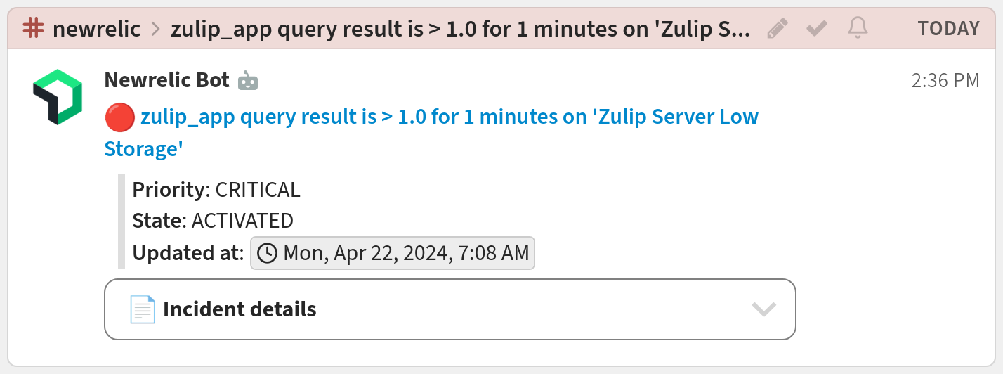 • With New Relic's custom payload feature, you can include custom fields in your Zulip notifications by configuring a zulipCustomFields dictionary in your notification payload template. The keys of zulipCustomFields will be displayed in the Zulip notification message, so we recommend that they be human-readable and descriptive. The values of the dictionary can be strings, integers, booleans, or lists of the those same data types.